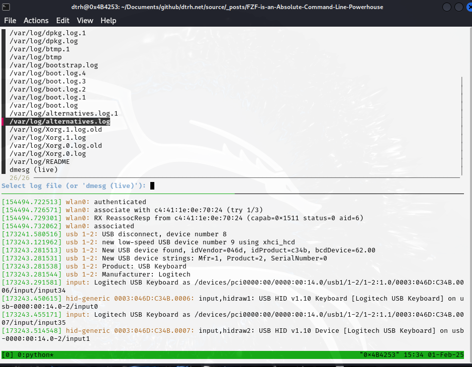 Split tmux horizontally: top pane lists /var/log plus a live dmesg option via fzf; bottom pane tails the chosen log. Run until you ‘Ctrl-C’.